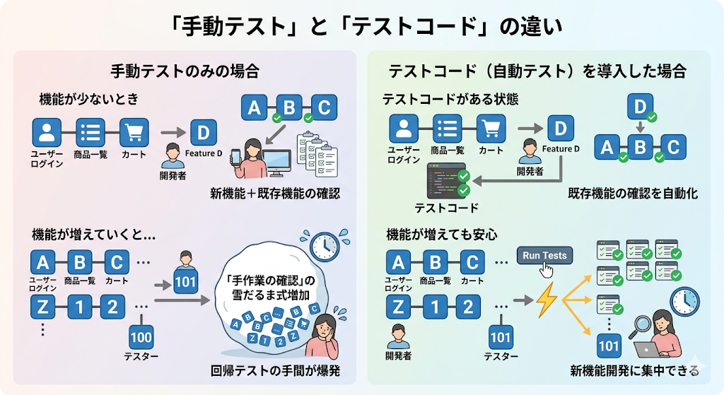 非エンジニアの方がイメージするテストは、実際にスマホやPCを触って確認する「手動テスト」だと思います。 もちろんこれも重要ですが、エンジニアが書く「テストコード」は役割が少し異なります。